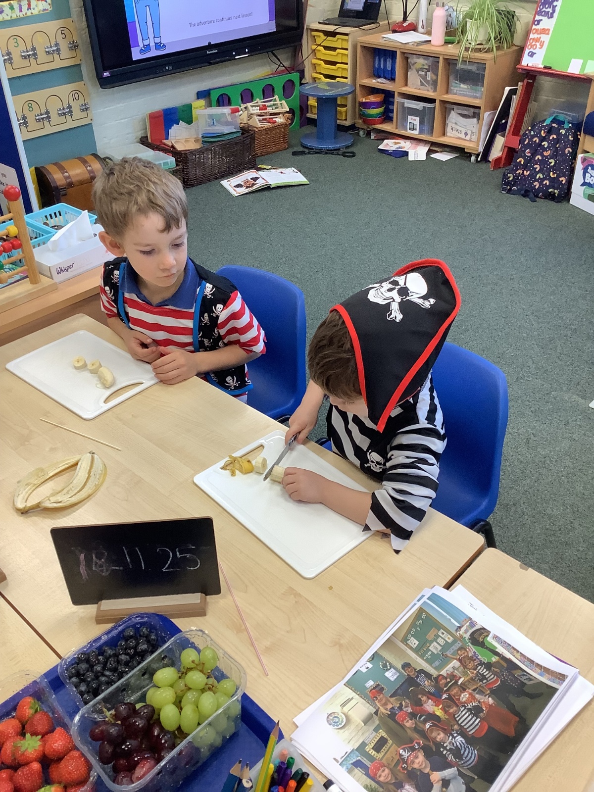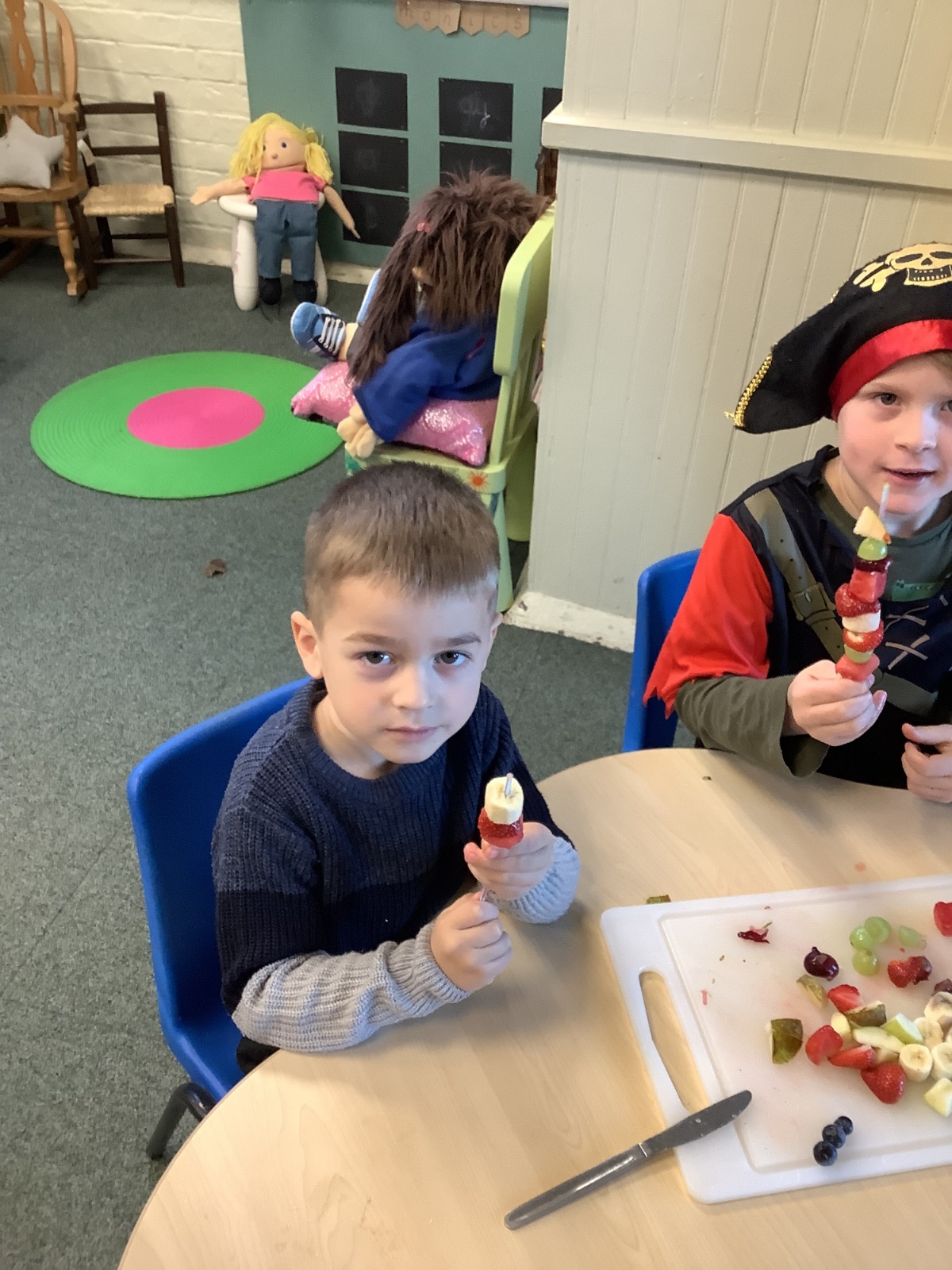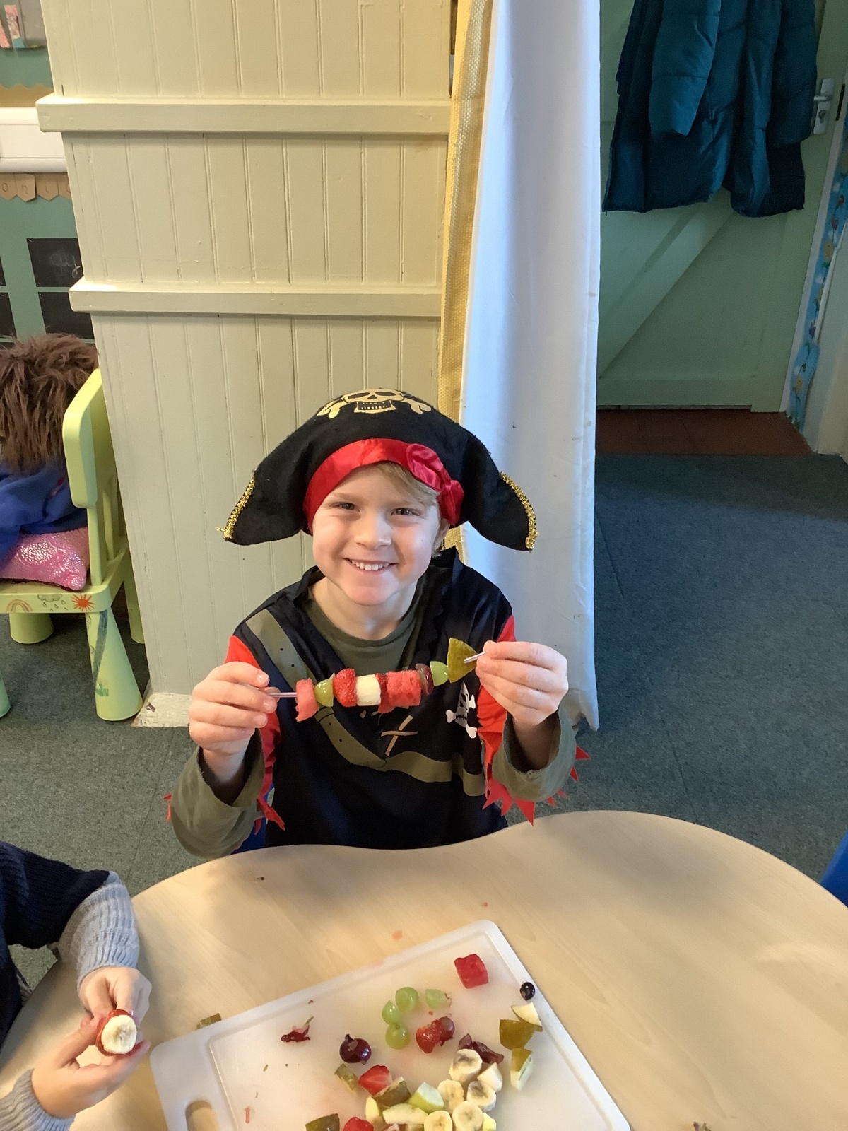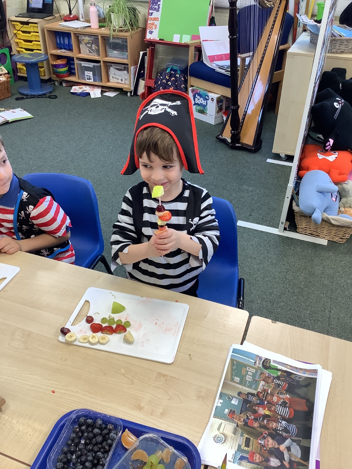 This half term we have been learning about pirates. On Tuesday 25th November we had a pirate day where we all came to school dressed as pirates. We raided Class 2 for treasure and made fruit kebabs.