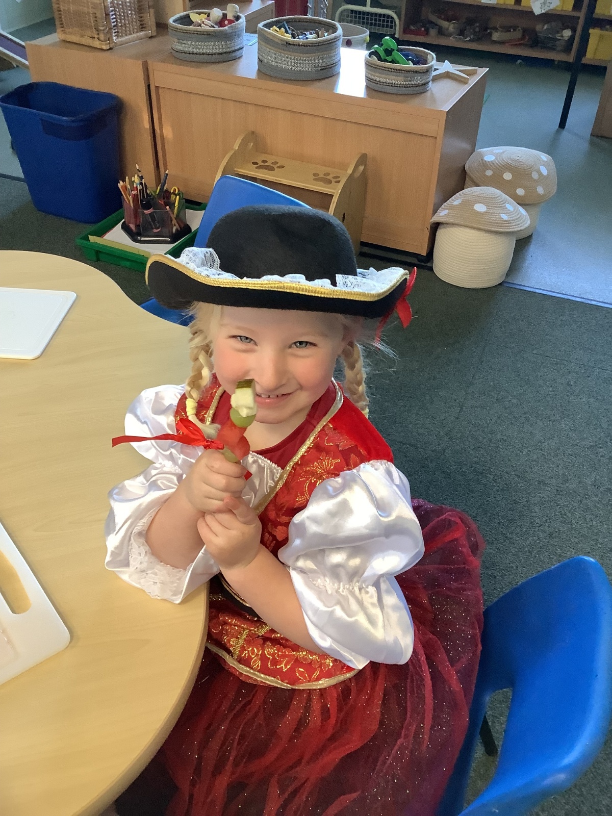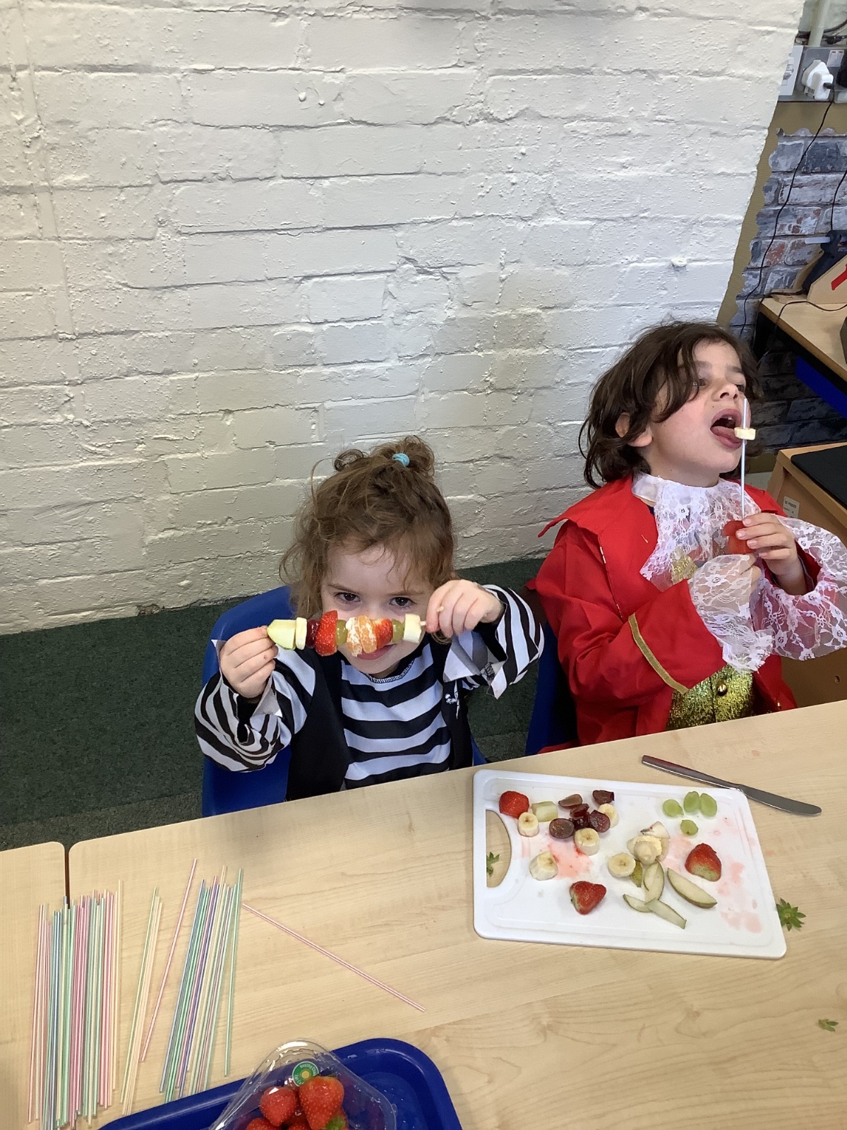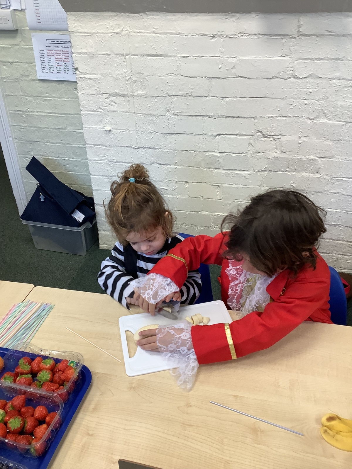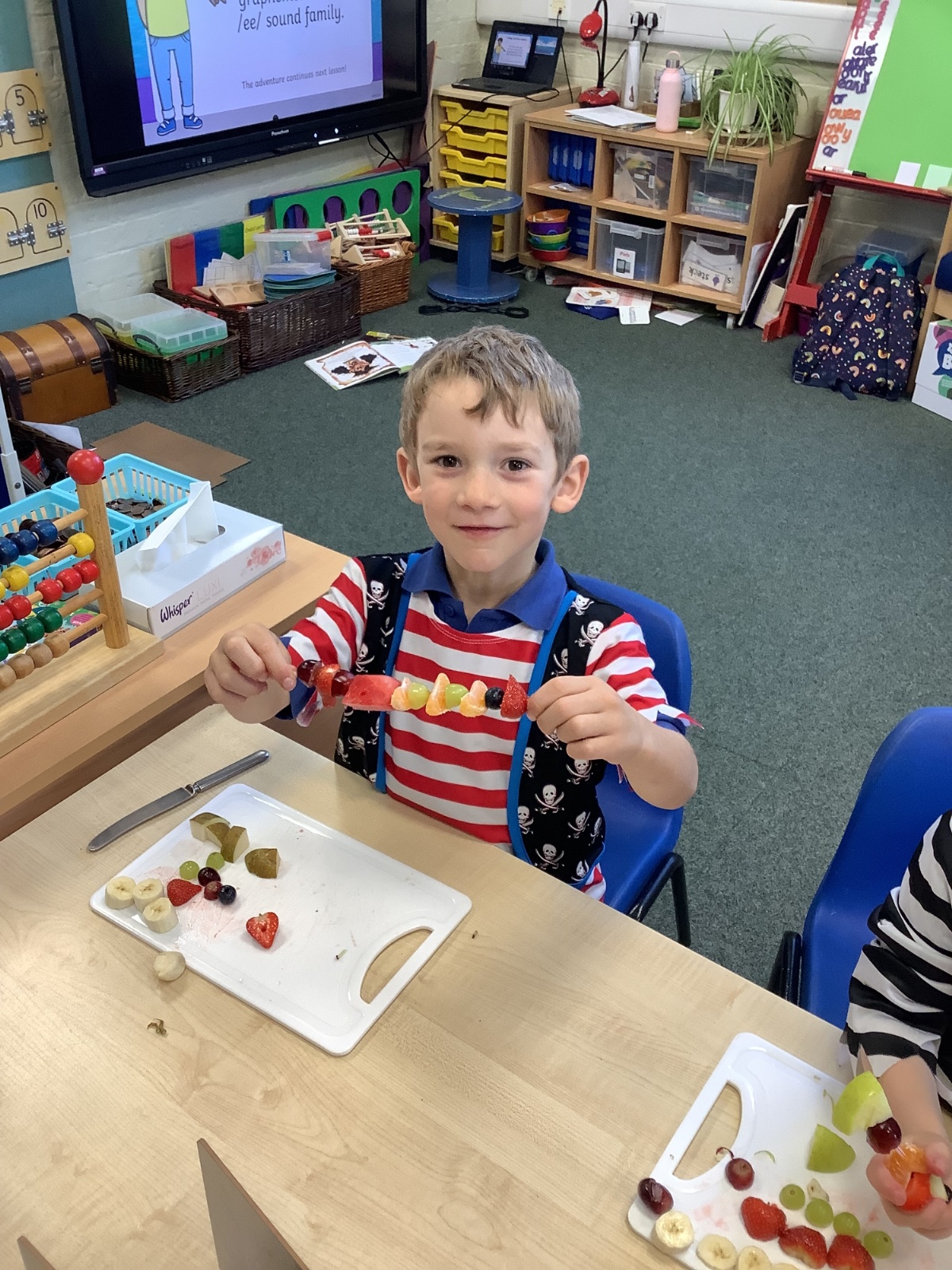 This half term we have been learning about pirates. On Tuesday 25th November we had a pirate day where we all came to school dressed as pirates. We raided Class 2 for treasure and made fruit kebabs.